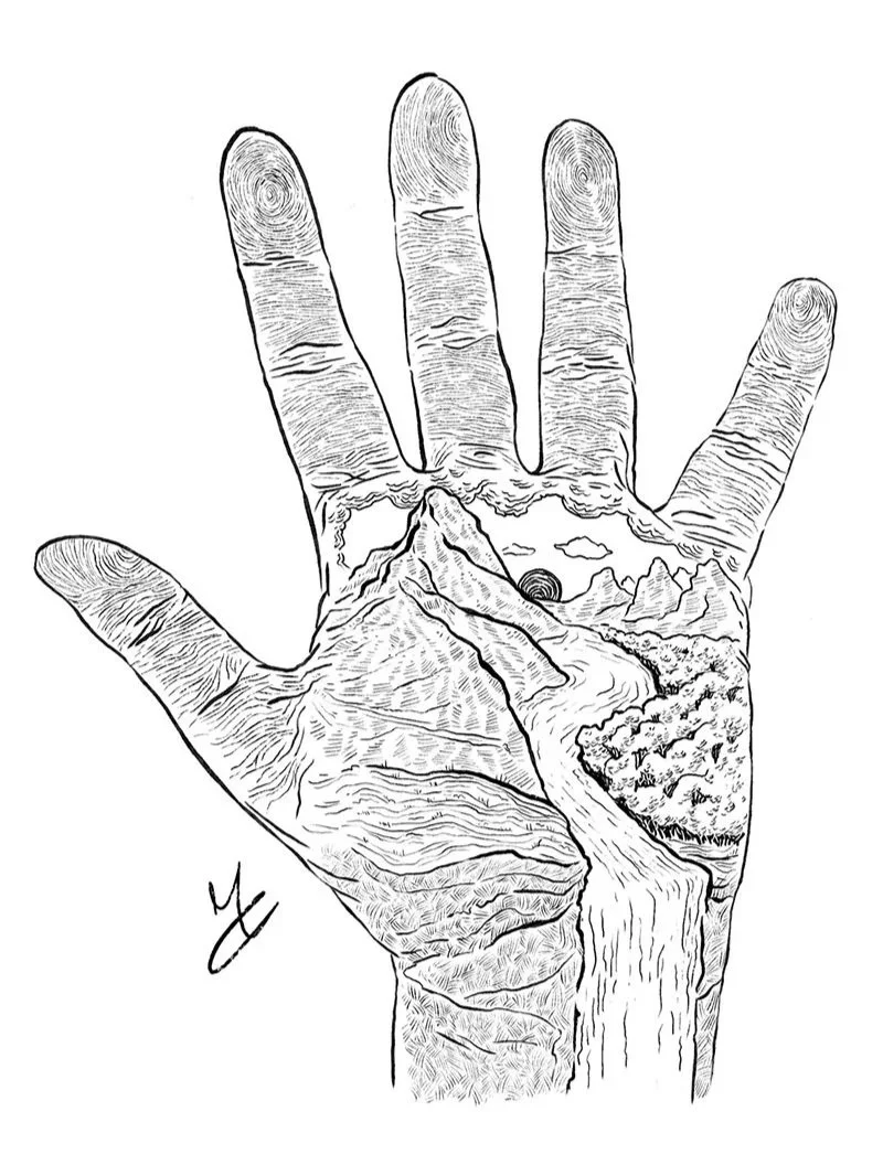 In this ongoing series, I explore themes of identity and our relationship to territory. Instead of focusing on the face, I work with the hand: its lines—almost a cartography of their own—suggest the development of a landscape meaningful to the subject portrayed. This landscape can be a real location tied to personal history, or an environment that holds symbolic value.