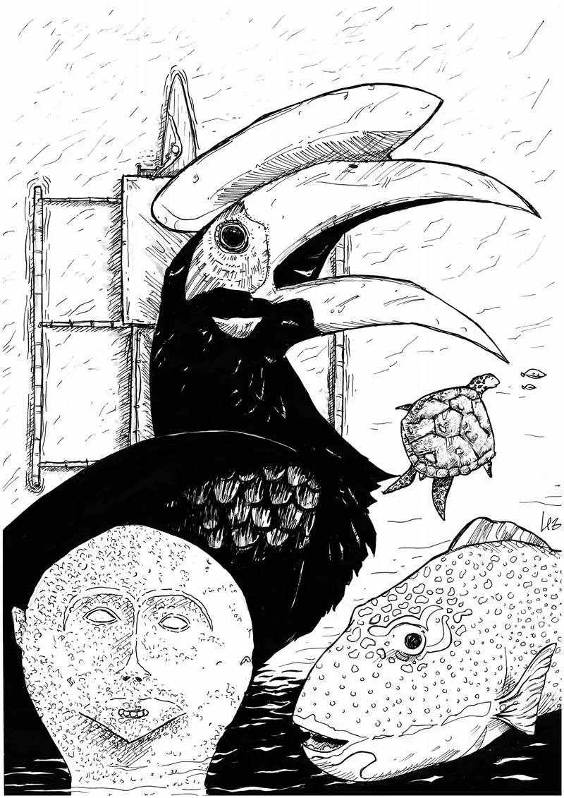This illustration was conceived to support an article about the wonders of Palawan Island. The centerpiece is the charismatic Palawan Hornbill, while the other animal subjects are the green sea turtle and the parrotfish. The trimaran in top view is a Bangka, the native watercraft of the Philippines, whereas the quirky statue on the bottom left is a Maitum anthropomorphic burial jar – I saw some of them in the National Museum of the Philippines in Manila. Their ancient, almost alien shapes struck me, so I decided to include them to bring a hint of mystery to the illustration.